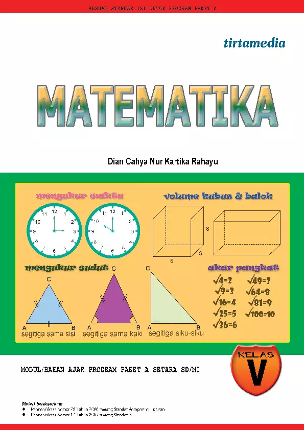 Sinopsis Buku: Buku ini merupakan bahan ajar Matematika untuk siswa Kelas V Program Paket A Setara SD/MI. Buku ini dirancang untuk membantu siswa dalam memahami dan menguasai konsep-konsep matematika yang relevan dengan tingkat kelas tersebut. Isi buku terdiri dari beberapa bab yang disusun secara terstruktur dan jelas, sehingga memudahkan siswa dalam mempelajari materi secara sistematis. Bab pertama membahas tentang Operasi Hitung Bilangan Bulat, termasuk penjumlahan, pengurangan, perkalian, pembagian, serta penerapan dalam operasi hitung campuran dan perpangkatan. Bab kedua melanjutkan dengan Pecahan, yang mencakup cara mengubah pecahan, penjumlahan, pengurangan, perkalian, pembagian, serta penerapan pecahan dalam perbandingan dan skala. Selanjutnya, dalam Bab Ketiga, siswa akan mempelajari tentang Mengukur Waktu dan Kecepatan, termasuk konsep waktu, pengukuran kecepatan, dan hubungan antara keduanya. Bab keempat membahas Luas Bangun Datar, seperti trapesium, layang-layang, serta penerapan dalam pemecahan masalah sehari-hari. Bab kelima berfokus pada Volume Bangun Ruang, meliputi kubus, balok, dan satuan volume. Terakhir, dalam Bab keenam, siswa akan mempelajari Sifat Bangun Datar dan Bangun Ruang, termasuk cara mengidentifikasi sifat-sifatnya dan bangun ruang sederhana. Buku ini dilengkapi dengan berbagai contoh soal dan latihan untuk memperkuat pemahaman siswa. Semua materi disusun secara logis dan mudah dipahami, sehingga memudahkan siswa dalam belajar matematika secara mandiri dan efektif. Buku ini sangat bermanfaat bagi para siswa yang ingin meningkatkan kemampuan matematika mereka, serta para pendidik yang ingin mengembangkan metode pembelajaran yang lebih interaktif dan praktis.