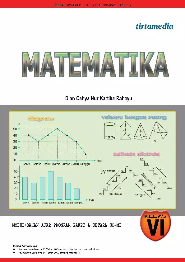 Sinopsis Buku: Buku ini merupakan bahan ajar Matematika untuk siswa Kelas VI Program Paket A Setara SD/MI. Buku ini dirancang untuk membantu siswa memahami dan menguasai konsep-konsep matematika yang relevan dengan tingkat kemampuan belajar siswa di tingkat tersebut. Buku ini terdiri dari beberapa bab yang membahas berbagai topik matematika secara sistematis dan terstruktur, dengan penjelasan yang jelas, contoh soal, serta latihan soal untuk memperkuat pemahaman. Bab pertama membahas tentang operasi hitung bilangan bulat dalam pemecahan masalah, termasuk sifat-sifat operasi hitung, operasi hitung campuran, FPB dan KPK, serta akar pangkat tiga. Bab kedua berisi materi tentang pecahan, seperti menyederhanakan dan mengurutkan pecahan, mengubah bentuk pecahan ke bentuk desimal, menentukan nilai pecahan, operasi hitung pecahan, serta perbandingan dan skala. Bab ketiga membahas tentang debit, termasuk satuan debit dan kecepatan. Bab keempat berisi materi tentang pengukuran volume dan luas, meliputi luas bangun datar dan volume bangun ruang. Bab kelima membahas sistem koordinat, termasuk denah letak benda, koordinat posisi benda, dan koordinat Kartesius. Bab keenam berisi tentang pengolahan data, seperti mengumpulkan dan menyajikan data, serta menafsirkan hasil pengolahan data. Buku ini dilengkapi dengan latihan soal yang beragam untuk memperkuat pemahaman siswa, serta penjelasan yang mudah dipahami dan relevan dengan kurikulum. Buku ini sangat bermanfaat untuk meningkatkan kemampuan berpikir logis, keterampilan matematika, serta pemecahan masalah dalam kehidupan sehari-hari. Dengan mempelajari materi dalam buku ini, siswa diharapkan dapat mencerdaskan kehidupan bangsa sebagaimana tujuan pendidikan nasional.