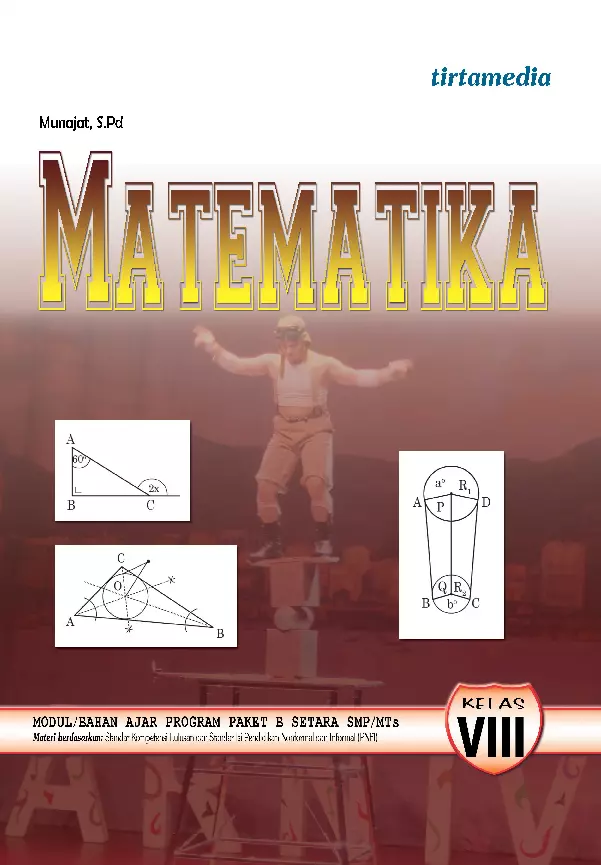 Sinopsis Buku: Buku ini merupakan bahan ajar Matematika untuk siswa kelas VIII Program Paket B Setara SMP/MTs. Buku ini disusun berdasarkan Peraturan Menteri Pendidikan Nasional Nomor 14 Tahun 2007 tentang Standar Isi dan mengacu pada Peraturan Menteri Pendidikan Nasional Nomor 23 Tahun 2006 tentang Standar Kompetensi Lulusan. Buku ini bertujuan untuk membantu peserta didik dalam mempelajari matematika secara mandiri, efektif, dan efisien. Buku ini mencakup beberapa bab penting dalam kurikulum matematika kelas VIII, antara lain: 1. Segitiga dan Segiempat – Bab ini menjelaskan tentang pengertian dan sifat-sifat berbagai jenis segiempat seperti jajar genjang, persegi panjang, belah ketupat, persegi, trapesium, dan layang-layang. Selain itu, bab ini juga membahas cara menurunkan dan menghitung rumus keliling dan luas segiempat, serta jenis-jenis segitiga berdasarkan sisi dan sudutnya. 2. Dalil Pythagoras – Bab ini menjelaskan tentang cara menemukan dan menggunakan dalil Pythagoras dalam menyelesaikan berbagai masalah matematika terkait segitiga siku-siku. 3. Lingkaran – Bab ini membahas tentang lingkaran dan bagian-bagian lingkaran, serta berbagai konsep yang berkaitan dengan lingkaran. Selain itu, buku ini juga mengenalkan konsep-konsep matematika seperti sistem persamaan linear dua variabel, termasuk cara menyelesaikan sistem tersebut, membuat model matematika dari masalah nyata, serta menafsirkan hasil penyelesaian dalam konteks masalah. Buku ini ditemani oleh pendekatan pembelajaran yang induktif, tematik, dan berbasis kecakapan hidup, serta menggunakan sistem modular yang menekankan pada belajar mandiri, ketuntasan belajar, dan kemajuan berkelanjutan. Dengan materi yang disusun secara terstruktur dan jelas, buku ini diharapkan dapat menjadi sumber belajar yang bermanfaat dan mendukung pencapaian kompetensi lulusan yang ditetapkan dalam standar nasional pendidikan.
