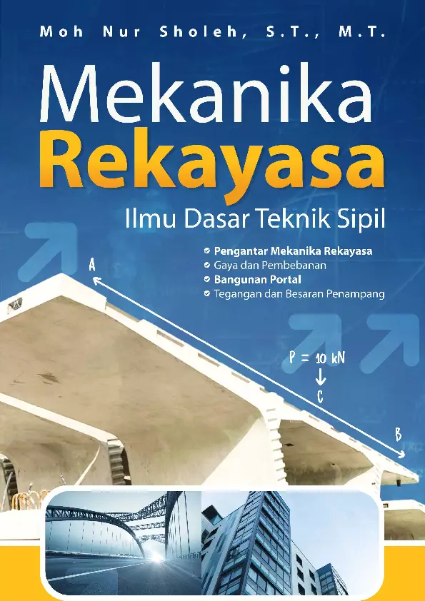 Sinopsis Buku: Buku ini merupakan bahan ajar yang dirancang untuk memperkaya pemahaman mahasiswa dalam bidang Ilmu Dasar Teknik Sipil, khususnya dalam disiplin Mekanika Rekayasa. Buku ini terdiri dari empat bab yang disusun secara terstruktur dan komprehensif, dengan fokus pada konsep-konsep dasar yang menjadi fondasi penting dalam studi teknik sipil. Bab I membahas pengantar mekanika rekayasa, yang memberikan gambaran umum mengenai pentingnya ilmu ini dalam dunia teknik sipil. Bab II mengenai gaya dan pembebanan, yang mencakup konsep dasar gaya, reaksi tumpuan, serta penerapan dalam perhitungan balok sederhana. Bab III memperdalam pemahaman tentang bangunan portal, baik yang simetris maupun tidak simetris. Bab IV berfokus pada tegangan dan besaran penampang, yang mencakup perhitungan luas penampang, titik berat, momen inersia, serta analisis tegangan akibat gaya normal, momen lentur, dan gaya geser. Selain itu, setiap bab dilengkapi dengan latihan soal untuk memperdalam pemahaman dan kemampuan mahasiswa. Buku ini tidak hanya berfungsi sebagai bahan ajar, tetapi juga dapat menjadi referensi dalam penelitian dan pengembangan bidang teknik sipil. Dengan memahami konsep-konsep yang disampaikan dalam buku ini, mahasiswa akan lebih siap menghadapi tantangan dalam dunia rekayasa dan memperkuat dasar-dasar ilmu teknik sipil yang menjadi kompetensi utama dalam bidang ini.