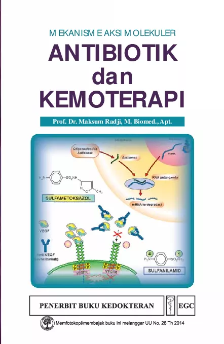 Buku ini difokuskan pada pemahaman tentang mekanisme aksi molekul antibiotik yang menghambat dinding sel bakteri sintesis protein dan sintesis asam nukleat bakteri Buku ini menjelaskan tentang mekanisme aksi molekuler senyawa kemoterapi yang difokuskan pada kemoterapi mikrobakteria kemoterapi antijamur kemoterapi antivirus dan kemoterapi antikanker Buku ini juga menjelaskan tentang strategi pengobatan penyakit kanker dengan mekanisme aksi molekuler senyawa kemoterapi antikanker dan pendekatan baru mengenai terapi kanker meliputi terapi tepat sasaran dan terapi antibodi monoklonal Terdapat juga bahasan perkembangan penggunaan vaksin kanker untuk melengkapi regimen