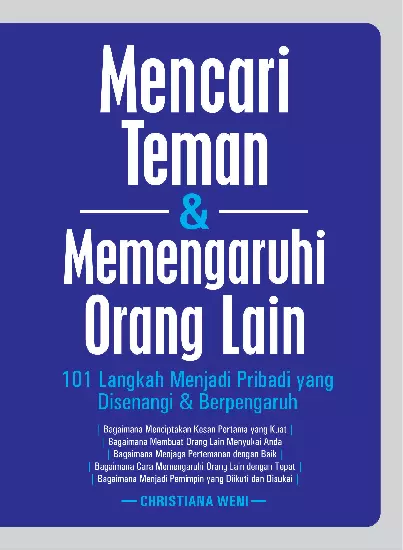 Buku ini berisi 101 tips yang akan membantu Anda mendapatkan banyak teman sekaligus menjadikan diri Anda menjadi sosok yang berpengaruh di mata teman teman Anda Buku ini berisi tips tips untuk membantu menciptakan kesan pertama yang kuat membuat orang lain menyukai Anda menjaga hubungan pertemanan dengan baik menjadi sosok yang berpengaruh dan menjadi sosok pemimpin yang baik di kalangan teman teman Anda