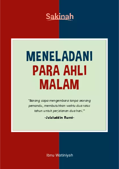 Buku ini menceritakan tentang mereka yang memanfaatkan malam dengan sebaik baiknya untuk menggapai rida Ilahi Kita tahu bahwa masa kejayaan Islam yang dikenal dengan The Golden Age bukan terjadi tiba tiba Saat itu sumber daya manusianya sangat berkualitas dan tiada tandingannya Mereka melembutkan melunakkan menenangkan menentramkan mengilapkan dan menyinari kalbunya dengan menghidupkan malam sehingga mengalami kemenangan yang gemilang Saat malam tiba ibadah mereka sangat luar biasa dan mengagumkan Siapa yang memandangnya mereka akan takjub dan terkesima Malam itu mereka bagaikan para pendeta suci yang bercengkerama dan bercinta dengan Allah