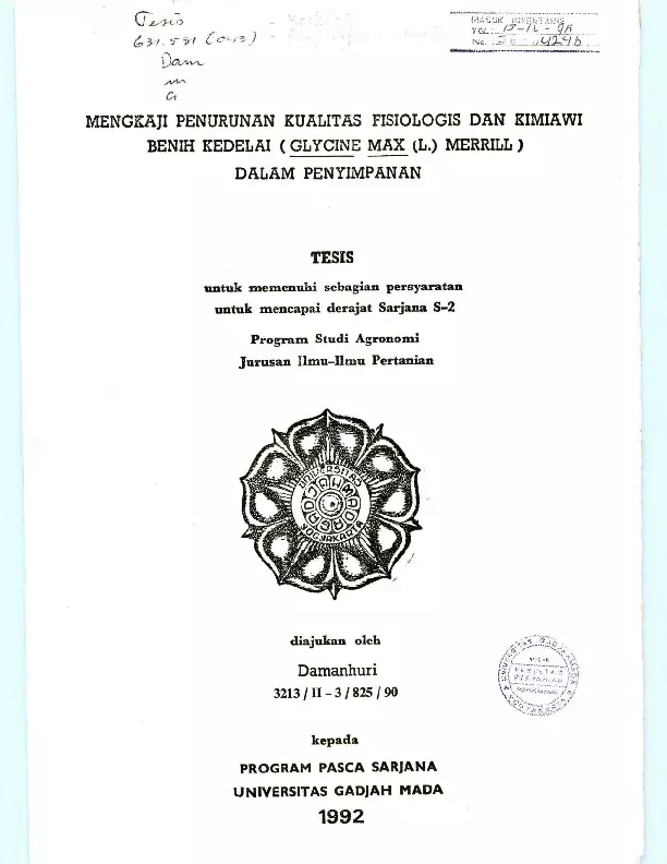 Mengkaji Penurunan Kualitas Fisiologis Dan Kimiawi Benih Kedelai (Glycine Max (L.) Merrill) Dalam Penyimpanan Damanhuri Fakultas Pertanian UGM Konten Lokal Konten Lokal 31103