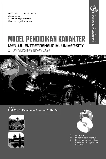 Sinopsis Buku: Buku ini berjudul *Model Pendidikan Karakter Menuju Entrepreneurial University di Universitas Brawijaya*, yang ditulis oleh Hendrawan Soetanto, Aulanni’am, Bambang Guritno, dan Bambang Suharto. Buku ini merupakan upaya untuk merangkum dan menelaah pengembangan pendidikan karakter yang telah dilaksanakan di Universitas Brawijaya (UB) selama ini. Penulis menekankan bahwa pendidikan karakter bukan hanya sekadar penanaman nilai-nilai moral, tetapi juga merupakan upaya pembentukan watak yang mampu menghadapi tantangan kehidupan yang kompleks dan tidak terduga. Dalam konteks pendidikan tinggi, penulis mengungkapkan bahwa kecerdasan intelektual semata tidak cukup untuk menghadapi dunia pasca sekolah yang seringkali ganas dan tidak terprediksi. Dalam situasi seperti ini, karakter mulia menjadi penyelemat yang mampu membimbing individu keluar dari kesulitan hidup. Karakter mulia dijelaskan sebagai wujud dari kepatuhan terhadap Tuhan, ketangguhan dalam menghadapi kesulitan, kreativitas dalam menemukan solusi, dan cinta kasih terhadap sesama manusia. Buku ini juga membahas konsep APEL sebagai nilai-nilai karakter yang dikembangkan di UB, yaitu *Agamis, Pintar, Peduli, Entrepreneurship, Lembut, Lugas, dan Luwes*. APEL ini tidak hanya menjadi akronim, tetapi juga sebagai ciri khas wilayah Kota Batu dan Kabupaten Malang, tempat berdirinya Universitas Brawijaya. Penulis berharap APEL dapat menjadi icon baru yang membuat UB lebih dikenal di tingkat internasional. Selain itu, buku ini juga menyadari bahwa pengembangan pendidikan karakter memerlukan perenungan mendalam dan pengalaman empiris yang dapat menjadi pelita bagi kegelapan dunia akademik. Penulis menyampaikan terbuka terhadap kritik dan saran yang dapat dikirimkan melalui e-mail: hendrawan07@ub.ac.id. Buku ini merupakan hasil karya ilmiah yang dirancang untuk menjadi rujukan dalam pengembangan pendidikan karakter di berbagai lingkungan sesuai dengan situasi dan kondisi yang relevan. Buku ini juga menyertakan informasi terkait hak cipta dan sanksi pelanggaran, serta informasi penerbit dan kontak yang dapat diakses untuk konsultasi lebih lanjut.