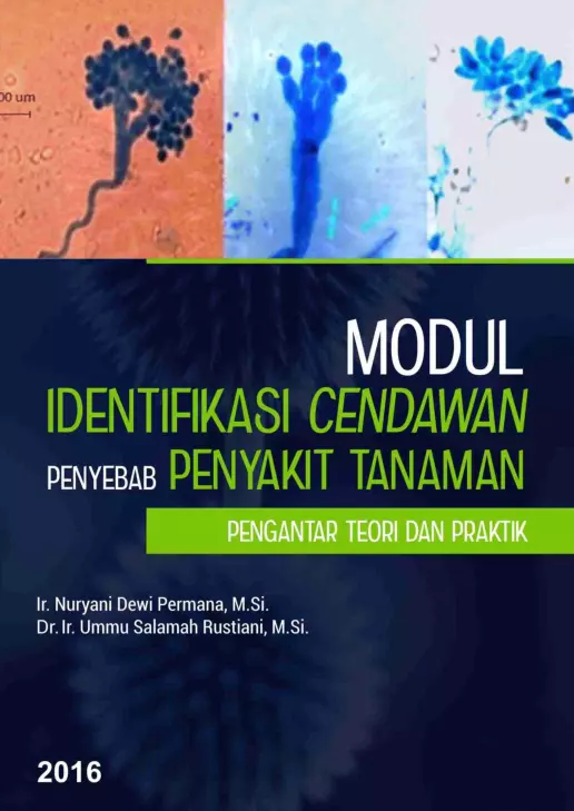 Buku Modul Identifikasi Cendawan Penyebab Penyakit Tanaman ini terdiri dari dua materi bahan ajar dan materi praktikum Modul ini merupakan pengantar pengenalan cendawan secara umum tata nama dan klasifikasi terbaru cendawan tular benih uji kesehatan benih dan SALB South American Leaf Blight untuk contoh cendawan OPTK A1 Modul disusun berdasarkan beberapa referensi tentang ilmu penyakit tanaman yang disebabkan oleh cendawan serta kunci identifikasi cendawan secara morfologi dan molekuler yang merupakan novelty sebagian disertasi salah satu tim Penulis Modul juga telah direvisi beberapa kali untuk memenuhi beberapa penyempurnaan Cendawan banyak berperan dalam kehidupan sehari hari khususnya cendawan yang dapat dikonsumsi karena mengandung gizi yang baik berperan dalam industri makanan dan minuman Akan tetapi tidak sedikit pula cendawan yang mengakibatkan kerugian bagi manusia Cendawan yang menguntungkan atau dapat dikonsumsi karena memiliki nilai ekonomis tinggi di antaranya yaitu Volvariella volvacea atau cendawan merang Auricularia polytricha atau cendawan kuping Lentinus edodes atau cendawan shitake dan Agaricus spp atau cendawan putih Adapun cendawan yang berperan dalam industri makanan dan minuman sebagai contoh di antaranya yaitu Monilia sitophila berperan dalam pembuatan oncom merah atau cendawan oncom merah Rhizopus oryzae berperan dalam pembuatan tempe atau cendawan tempe Saccharomyces cerevisiae banyak digunakan dalam industri rumah tangga seperti pembuatan tape roti dan pembuatan minuman anggur dengan kadar alkohol mencapai 14 Pada awalnya cendawan masuk dalam Kingdom Plantae tumbuhan Namun berdasarkan temuan histologi dan molekuler cendawan dikelompokkan dalam Kingdom tersendiri yaitu Kingdom Fungi untuk cendawan sebenarnya yang mempunyai kedekatan ke arah Kingdom Animalia hewan karena dinding selnya mengandung kitin Sedangkan cendawan tidak sebenarnya semu dimasukkan dalam 2 dua Kingdom yang lebih mendekati ke Kingdom Plantae karena kandungan dinding selnya terdiri dari selulosa dan beberapa mengandung klorofil yakni Kingdom Stramenophilla dan Kingdom Protista