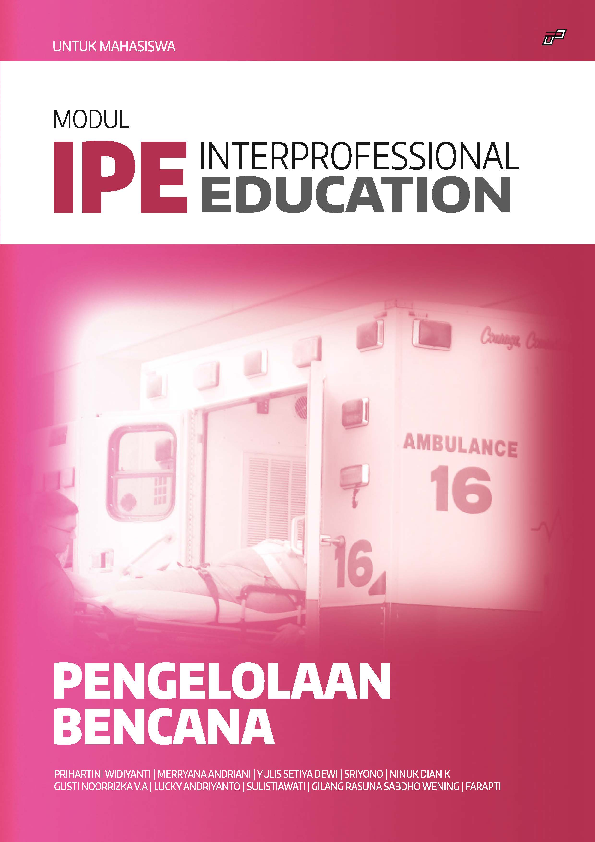 Bab 1 DESKRIPSI MODUL Modul ini merupakan buku panduan belajar bagi mahasiswa dalam meningkatkan kemampuannya untuk berkolaborasi dalam pengelolaan bencana Dalam modul ini setiap mahasiswa diberikan kesempatan untuk belajar dengan dari dan mengenai profesi kesehatan lainnya melalui berbagai metode pembelajaran yang disiapkan sehingga diharapkan dapat memainkan peran profesionalnya dengan menghormati keberadaan profesi lain Modul ini juga memberikan panduan bagi mahasiswa dalam menyusun Rencana Pengelolaan Bencana disaster management plan yang menyeluruh terarah dan terpadu yang ditangani secara interprofesional di bidang kesehatan Masalah kesehatan dan penanganan kejadian bencana terkini akan digunakan sebagai trigger case untuk mempelajari dan melatih kemampuan bekerja sama dan melatih penanganan yang kolaboratif dan sinergis antarprofesi kesehatan Setelah mengikuti Modul Pengelolaan bencana ini mahasiswa diharapkan akan mampu menerapkan mitigasi persiapan dan respons terhadap bencana dan proses pemulihan akibat bencana Selain itu mahasiswa diharapkan mampu melatih masyarakat tangguh bencana Nama Program Studi Nama Modul Semester Metode Pembelajaran Kedokteran Kebidanan Kedokteran Gigi Farmasi Keperawatan Kesehatan Masyarakat Gizi dan Psikologi Pengelolaan Bencana Semester 5 ke atas Fakultas Kedokteran Fakultas Kedokteran Gigi Fakultas Farmasi Fakultas Keperawatan Fakultas Kesehatan Masyarakat Fakultas Psikologi e learning studi kasus presentasi role play praktik lapangan 1