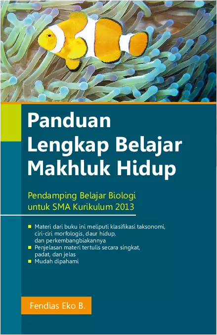 Sinopsis Buku: Buku *Panduan Lengkap Belajar Makhluk Hidup untuk SMA Kurikulum 2013* adalah panduan terstruktur dan komprehensif yang dirancang untuk membantu siswa SMA memahami konsep-konsep utama dalam biologi terkait klasifikasi makhluk hidup, struktur, daur hidup, dan mekanisme perkembangbiakannya. Buku ini menyajikan materi secara singkat, padat, dan mudah dipahami, sehingga memudahkan proses belajar dan pemahaman konsep. Materi dalam buku ini terdiri dari beberapa bab utama, yaitu: 1. Klasifikasi Makhluk Hidup – menjelaskan cara pengelompokan makhluk hidup berdasarkan karakteristik tertentu, metode klasifikasi, serta tingkatan taksonomi. 2. Virus – membahas ciri-ciri, struktur, mekanisme replikasi, dan penyakit yang disebabkan oleh virus. 3. Monera – menjelaskan tentang Archaebacteria, Eubacteria, Bakteri, dan Cyanobacteria. 4. Protista – memperkenalkan berbagai jenis protista yang menyerupai tumbuhan, hewan, dan jamur. 5. Fungi – membahas karakteristik, reproduksi, klasifikasi, serta hubungan simbiosis fungi. 6. Dunia Tumbuhan – membahas tumbuhan lumut, tumbuhan paku, dan tumbuhan berbiji. 7. Dunia Hewan – menjelaskan tentang Porifera dan berbagai kelompok hewan lainnya. Buku ini dilengkapi dengan penjelasan yang jelas, disertai ilustrasi dan penjelasan singkat, sehingga memudahkan siswa dalam menguasai materi biologi secara sistematis dan mendalam. Buku ini sangat cocok sebagai referensi pelengkap untuk belajar biologi di tingkat SMA.