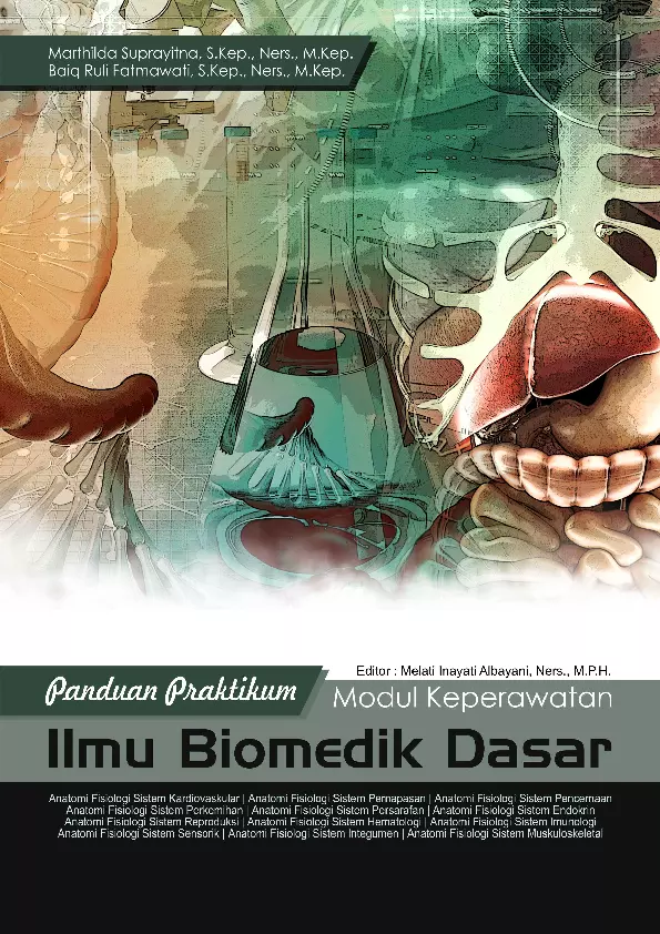 Sinopsis Buku: Buku ini merupakan modul keperawatan yang berjudul *Ilmu Biomedik Dasar*, disusun oleh Marthilda Suprayitna, S.Kep., Ners., M.Kep. dan Baiq Ruli Fatmawati, S.Kep., Ners., M.Kep. Buku ini dirancang sebagai bahan ajar yang mendukung pembelajaran mahasiswa DIII Keperawatan dalam memahami konsep-konsep dasar ilmu biomedik. Modul ini mencakup berbagai topik penting dalam bidang anatomi, fisiologi, dan aspek biokimia yang relevan dengan praktik keperawatan. Isi buku ini terdiri dari beberapa modul yang membahas secara terstruktur dan mendalam sistem tubuh manusia, antara lain: 1. Sistem Kardiovaskular – Membahas anatomi dan fisiologi jantung, pembuluh darah, serta mekanisme sirkulasi darah. 2. Sistem Pernapasan – Menjelaskan struktur dan fungsi sistem pernapasan, termasuk proses respirasi dan mekanisme ventilasi. 3. Sistem Pencernaan – Mencakup anatomi dan fisiologi saluran pencernaan, serta proses pencernaan dan penyerapan nutrisi. 4. Sistem Perkemihan – Memperkenalkan struktur dan fungsi organ-organ sistem perkemihan, serta proses ekskresi. Selain itu, buku ini juga menyertakan panduan praktikum yang mendukung pemahaman konseptual melalui kegiatan belajar-mengajar yang interaktif. Buku ini dilengkapi dengan daftar gambar yang membantu memperjelas konsep anatomi dan fisiologi yang disampaikan. Buku ini merupakan sumber belajar yang komprehensif dan relevan, dirancang untuk membekali mahasiswa keperawatan dengan pengetahuan dasar biomedik yang diperlukan dalam praktik keperawatan sehari-hari.