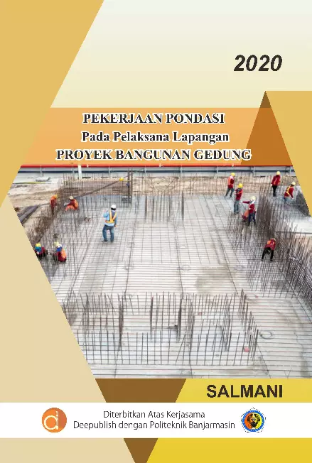Buku ini menjelaskan secara tuntas dan mendetail tentang pelaksanaan pekerjaan pondasi di lapangan pada proyek pekerjaan bangunan gedung mulai dari pekerjaan tanah untuk melaksanakan pekerjaan pondasi pekerjaan struktur yang terdiri dari pekerjaan struktur beton yang dimulai dengan pekerjaan perancah struktur kayu dari pekerjaan sambungan sampai pekerjaan atap dan struktur baja pekerjaan arsitektur sampai dengan pekerjaan pelaporan yang merupakan tahap akhir dari proyek pekerjaan bangunan gedung sehingga jika anda mempelajari isi buku ini selayaknya sebagai seorang kontraktor atau pelaksana lapangan pekerjaan proyek bangunan gedung sebagaimana salah satu misi dari Program Studi Teknik Sipil Politeknik