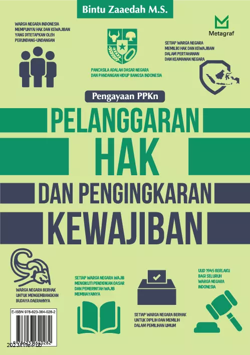 Manusia sebagai makhluk sosial dan warga negara pastinya tidak terlepas dari berbagai macam norma dan nilai yang berlaku dalam kelompok sosialnya Indonesia merupakan salah satu negara demokratis dan terbuka sehingga memiliki aturan yang jelas serta tidak bemakna ganda Hak dan kewajiban dalam kehidupan sebagai warga negara di Indonesia sudah menjadi hal atau pengetahuan yang wajib diketahui oleh warga negara Pelanggaran hak dan pengingkaran kewajiban dapat menyebabkan ketidakadilan dan ketimpangan di berbagai bidang Hal ini dapat menyebabkan kehidupan sosial dalam bermasyarakat menjadi kurang hannonis dan tidak tercipta kerukunan Setiap manusia sudah memiliki porsi hak dan kewajibannya masing masing Terjadinya pelanggaran hak dan pengingkaran kewajiban dapat disebut sebagai perbuatan atau perilaku yang menyimpang Pelanggaran hak merupakan tindakan yang melanggar kebebasan hak orang lain Adapun pengingkaran kewajiban merupakan perilaku yang menghindari atau tidak mau melaksanakan kewajiban secara bertanggung jawab Buku ini mencoba membahas pengertian hak dan kewajiban warga negara baik itu dalam Pancasila maupun UUD NRI Tahun 1945 serta akibat terjadinya pengingkaran hak dan kewajiban warga negara