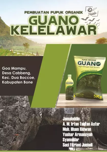 Ketersediaan guano yang melimpah sangat berpotensi untuk dijadikan sebagai pupuk organik di mana pupuk organik merupakan bahan pembenah tanah yang paling baik dibanding bahan pembenah lainnya pemanfaatannya selain menciptakan sistem pertanian yang ramah lingkungan juga dapat mengurangi ketergantungan petani terhadap pupuk kimia Salah satu tempat di Kabupaten Bone yang menyimpan potensi sumber bahan baku Guano yaitu Goa Mampu Goa mampu berada di Desa Cabbeng Kecamatan Dua Boccoe merupakan sarang kelelawar yang habitatnya telah bertahun tahun mendiami gua ketersediaan kotoran kelelawar guano di dalam Goa Mampu sangat berpotensi untuk dijadikan sebuah terobosan baru dalam meningkatkan taraf ekonomi masyarakat sekitar Goa Mampu melalui pemanfaatan guano menjadi pupuk alternatif pengganti pupuk kimia yang diusung oleh TIM PKM M STKIP Muhammadiyah Bone Buku panduan ini diharapkan memberikan gambaran meningkatkan em value em nilai dari Guano menjadi Pupuk organik serbaguna
