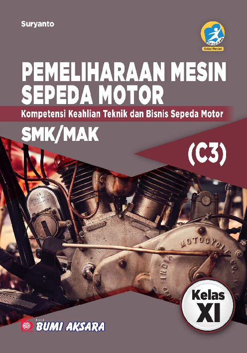 Buku ini ditulis sebagai salah satu sumber belajar siswa SMK MAK Kelas XI untuk mempelajari dan memperdalam materi Pemeliharaan mesin Sepeda Motor Selain itu buku ini ditulis secara umum dalam rangka ikut serta mencerdaskan bangsa Indonesia menjelang era globalisasi dalam perkembangan ilmu pengetahuan dan teknologi Buku ini disusun berdasarkan Peraturan Direktur Jenderal Pendidikan Dasar dan Menengah Kementerian Pendidikan dan Kebudayaan Nomor 464 D D5 KR 2018 tentang Kompetensi Inti dan Kompetensi Dasar Mata Pelajaran Muatan Nasional A Muatan Kewilayahan B Dasar Bidang Keahlian C1 Dasar Program Keahlian C2 dan Kompetensi Keahlian C3 Anda dapat mempelajari buku ini sebelum dan sesudah dibahas oleh guru dan dapat mendiskusikannya dengan teman agar mendapatkan hasil belajar yang maksimal Setiap bab dalam buku ini dilengkapi dengan Kompetensi Inti dan Kompetensi Dasar Kata Kunci Peta Konsep Tugas Info Rangkuman Refleksi Diri Proyek serta Soal Latihan Soal latihan diberikan beberapa jenis setelah akhir bab dan setiap akhir semester Pembahasan materi disajikan dengan bahasa yang lugas dan mudah kita pahami dari pembahasan secara umum ke pembahasan secara khusus Sebelum membaca rangkuman materi diharapkan Anda membuat rangkuman sendiri terlebih dahulu yang nantinya dibandingkan dengan rangkuman dalam buku Dengan demikian Anda dapat membandingkan pokok materi yang dianggap penting untuk dirangkum dan meningkatkan pemahaman Anda Pada akhir buku juga dilengkapi dengan Glosarium dan Indeks