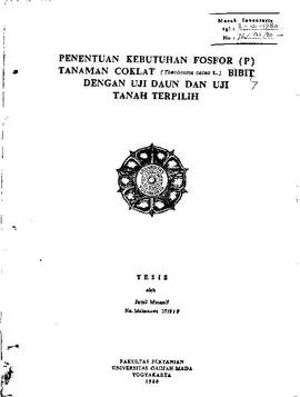 Penentuan Kebutuhan Fosfor (P) Tanaman Coklat (Theobroma Cacao L.) Bibit Dengan Uji Daun Dan Uji Tanah Terpilih Jamil Musanif Fakultas Pertanian UGM Konten Lokal Konten Lokal 31001