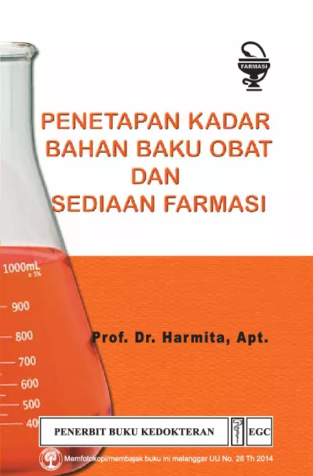 Buku Penetapan Kadar Bahan Baku Obat dan Sediaan Farmasi ini membahas teknik analisis secara volumetri titrimetri analisis spektrofotometri UV Vis dan pada bagian akhir disajikan prosedur penetapan kadar berbagai bahan baku obat dan sediaan farmasi Analisis secara volumetri yang dibahas mencakup titrasi asam basa titrasi redoks bromometri iodimetri serimetri permanganometri titrasi bebas air kompleksometri argentometri nitrimetri gravimetri dan titrasi potensiometri Setiap prosedur penetapan kadar dilengkapi dengan rumus bangun untuk mengetahui ke arah mana reaksi akan terjadi bobot molekul untuk mengetahui ekuivalensi zat tersebut terhadap pereaksi yang digunakan dan beberapa prosedur juga diberikan reaksi lengkap untuk mengetahui tahapan reaksi yang terjadi Buku ini terutama ditujukan bagi mahasiswa yang sedang studi di bidang kimia dan farmasi atau siapa saja yang hendak melakukan penetapan kadar bahan baku obat dan sediaan farmasi