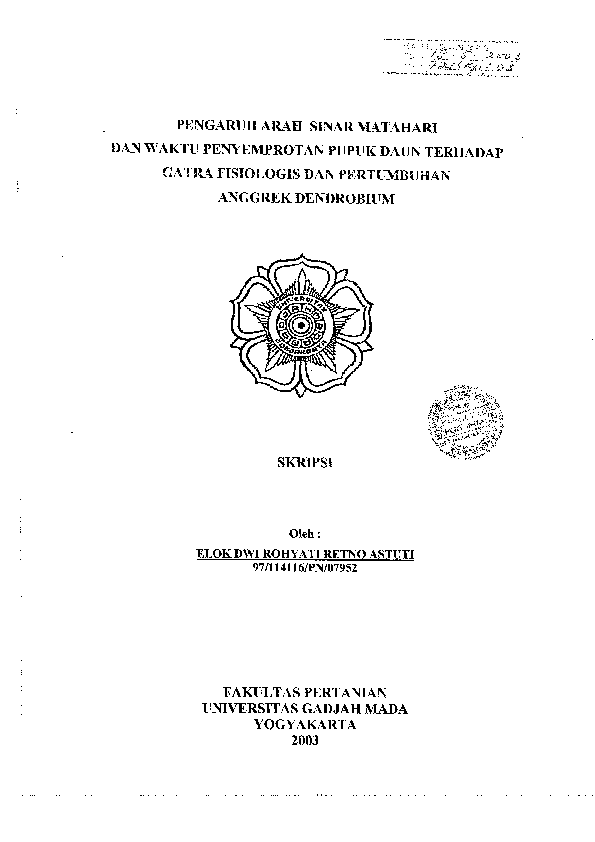 Pengaruh Arah Sinar Matahari Dan Waktu Penyemprotan Pupuk Daun Terhadap Gatra Fisiologis Dan Pertumbuhan Anggrek Dendrobium Elok Dwi Rohyati Retno Astuti Fakultas Pertanian UGM Konten Lokal Konten Lokal 48352