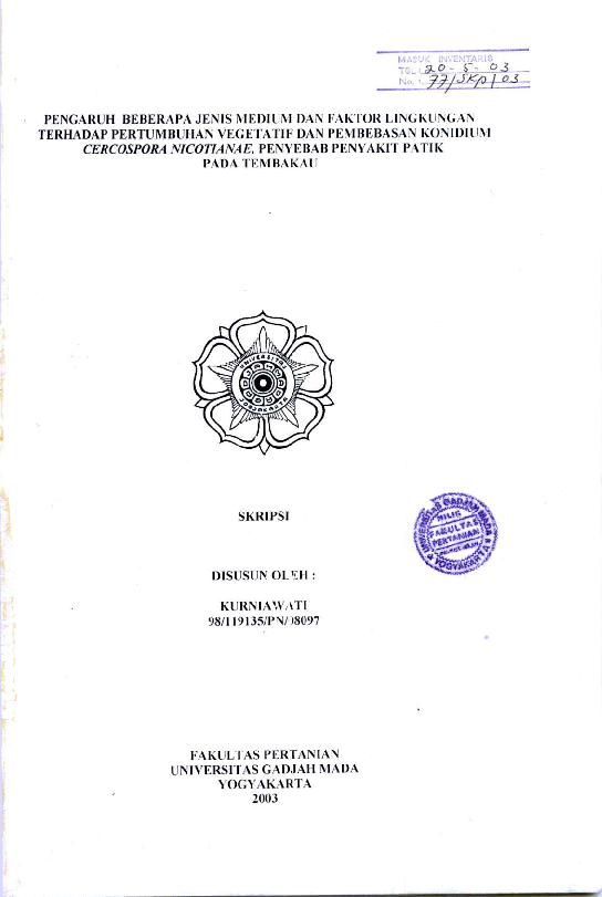 17 Pengamatan di bawah mikroskop dengan mengambil cuplikan koloni dari medium PDA terlihat adanya kumpulan hifa dan konidiofornya yang mirip dengan konidiofor yang teramati pada gejala penyakit patik pada daun tembakau Namun tidak ditemukan adanya konidium pada ujung ujung konidiofornya Hal ini dimungkinkan karena medium PDA atau kondisi lingkungan mikro yang lain pada medium tersebut tidak mendukung terbentuknya konidium Gambar 1 Koloni C nicotianae pada A agar air 2 dan B PDA masingmasing berumur 7 hari setelah inokulasi Untuk memastikan biakan murni tersebut adalah C nicotianae biakan yang diperoleh diinokulasikan ke tembakau Deli 4 berumur delapan minggu setelah tanam dengan mengambil daun kedua tiga empat dan lima dari bawah karena jamur ini mampu menginfeksi daun tembakau pada saat tanaman berada di pertanaman dan di pembibitan Selain itu daun tua lebih rentan dibandingkan dengan daun muda Jamur