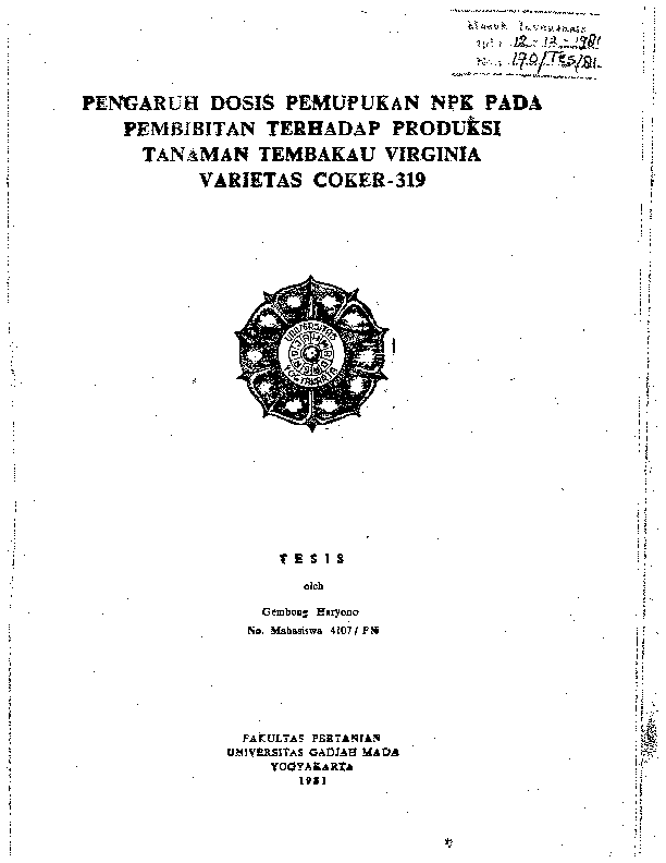 Pengaruh Dosis Pemupukan Npk Pada Pembibitan Terhadap Produksi Tanaman Tembakau Virginia Varietas Coker-319 Gembong Haryono Fakultas Pertanian UGM Konten Lokal Konten Lokal 48336