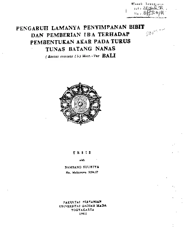 Pengaruh Lamanya Penyimpanan Bibit Dan Pemberian Iba Terhadap Pembentukan Akar Pada Turus Tunas Batang Nanas (Ananas Comosus (L) Merr.Var Bali Bambang Sulistya Fakultas Pertanian UGM Konten Lokal Konten Lokal 31366