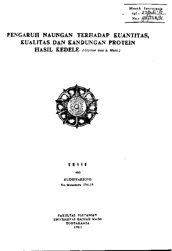 Pengaruh Naungan Terhadap Kuantitas, Kualitas Dan Kandungan Protein Hasil Kedele (Glycine Max L. Merr.) Hudhiyaksono Fakultas Pertanian UGM Konten Lokal Konten Lokal 31380