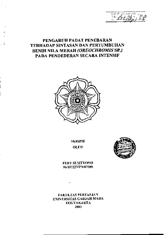 Pengaruh Padat Penebaran Terhadap Sintasan Dan Pertumbuhan Benih Nila Merah (Oreochromis sp.) Pada Pendederan Secara Intensif Fery Susityono Fakultas Pertanian UGM Konten Lokal Konten Lokal 48485