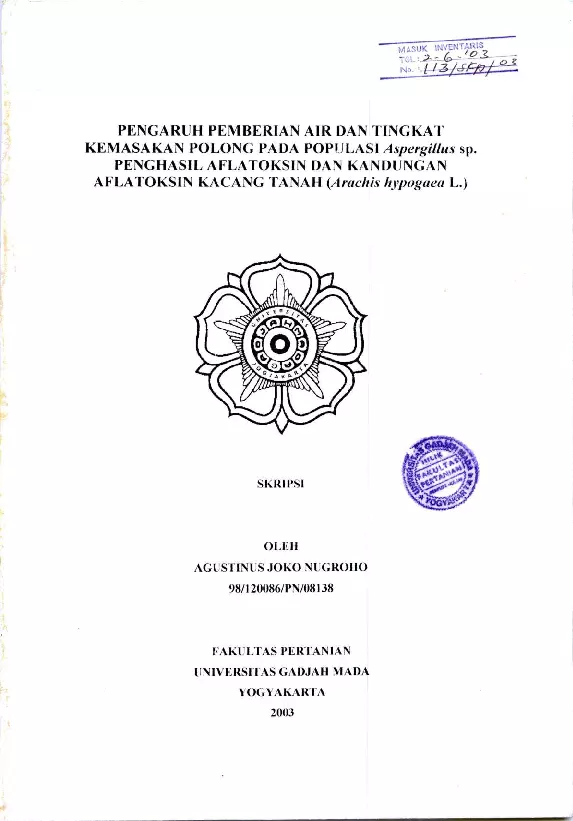 Pengaruh Pemberian Air Dan Tingkat Kemasakan Polong Pada Populasi Aspergillus sp. Penghasil Aflatoksin Dan Kandungan Aflatoksin Kacang Tanah Agustinus Joko Nugroho Fakultas Pertanian UGM Konten Lokal Konten Lokal 48271