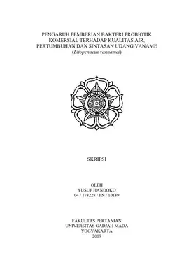 Pengaruh Pemberian Bakteri Probiotik Komersial Terhadap Kualitas Air, Pertumbuhan Dan Sintasan Udang Vaname (Litopenaeus Vannamei) Yusuf Handoko Fakultas Pertanian UGM Konten Lokal Konten Lokal 31331