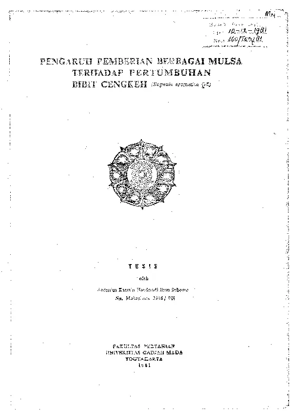 Pengaruh Pemberian Berbagai Mulsa Terhadap Pertumbuhan Bibit Cengkeh (Eugenia Aromatica Ok) Antonius Kasmin Hendriadi Ibnu Subowo Fakultas Pertanian UGM Konten Lokal Konten Lokal 48230