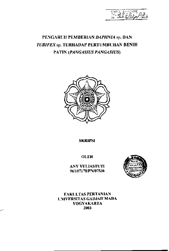 Pengaruh Pemberian Daphnia sp Dan Tubifex sp Terhadap Pertumbuhan Benih Patin (Pangasius Pangasius) Any Yuliastuti Fakultas Pertanian UGM Konten Lokal Konten Lokal 48291