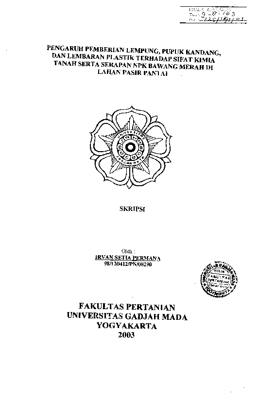 Pengaruh Pemberian Lempung, Pupuk Kandang, Dan Lembaran Plastik Terhadap Sifat Kimia Tanah Serta Serapan NPK Bawang Merah Di Lahan Pasir Pantai Irvan Setia Permana Fakultas Pertanian UGM Konten Lokal Konten Lokal 48458