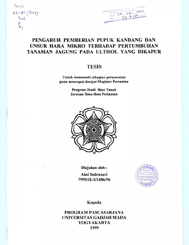 Pengaruh Pemberian Pupuk Kandang Dan Unsur Hama Mikro Terhadap Pertumbuhan Tanaman Jagung Pada Ultisol Yang Dikapur Aini Indrasari Fakultas Pertanian UGM Konten Lokal Konten Lokal 31150