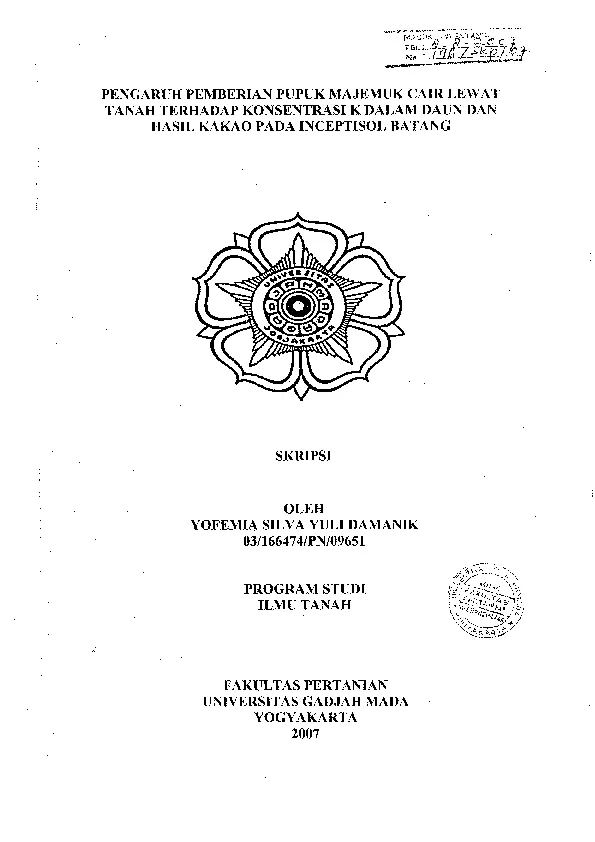 PENGARUH PEMBERIAN PUPUK MAJEMUK CAIR LEWAT TANAH TERHADAP KONSENTRASI K DALAM DAU N DAN HASIL KAKAO PADA INCEPTISOL BATANG Yofemia Silva Yuli Damanik Fakultas Pertanian UGM Konten Lokal Konten Lokal 48913