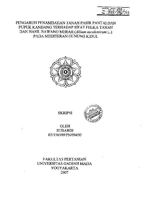 Pengaruh Penambahan Tanah Pasir Pantai Dan Pupuk Kandang Terhadap Sifat Fisika Tanah Dan Hasil Bawang Merah (Allium Ascalonicum L.) Pada Mediteran Gunung Kidul Subardi Fakultas Pertanian UGM Konten Lokal Konten Lokal 48876