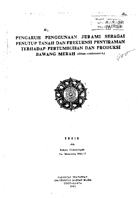 II TXNJAUAN PUSTAKA Tanaman bawang merah Allium ascalonicum L merupa kan tanaman saymran yang termasuk dalam familia Liliaceae Tanaman ini merupakan tanaman semusim atau tanaman setahun berumbi lapis dan berakar serabut Anonim 1977 Menurut Leopold 8c Kriedemann 1975 organ tanaman yang berkembang sehingga membentuk umbi lapis belum dapat diketahui dengan pasti tetapi menurut Heath HoldwortM cit Leo pold Kriedemann 1975 pada tanaman bawang bombay Allium cepa L pembentukan umbinya berasal dari penlmbunan senyawa karbohidrat ke pangkal daun yang masih muda kemudian di ikuti dengan berhentinya pertumbuhan meristem akar yaitu penghentian pembelahan sel pada umumnya dan dimulai pembengkakan pangkal daun Tanaman laim yang termasuk dalam familia Liliaceae ia lah bawang bombay Allium cepa L bawang putih Allium sa tivum L Umbi bawang merah ini dalam keadaan tua atau muda di gunakan sebagai sayuran campuran selada atau sebagai penye dap dan bahab rempah rempah Knott Deanon 1967 Tanaman bawang tumbuh pada berbagai jenis tanah teta pi biasanya cocok tumbuh pada tanah bertekstur geluh pasiran atau geluh debuan Tanah harus gembur subur dan mengandung kelembaban yang cukup untuk menunjang pertumbuhannya Knott Deanon 1967 Selain itu untuk dapat tumbuh dengan baik ta naman bawang merah membutuhkan syarat syarat tertentu dianta ranya ketinggian tempat 0 800 meter dari permukaan laut