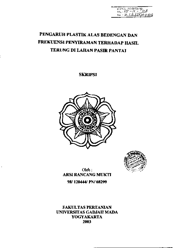 Pengaruh Plastik Alas Bedengan Dan Frekuensi Penyiraman Terhadap Hasil Terung Di Lahan Pasir Pantai Arsi Rancang Mukti Fakultas Pertanian UGM Konten Lokal Konten Lokal 48302