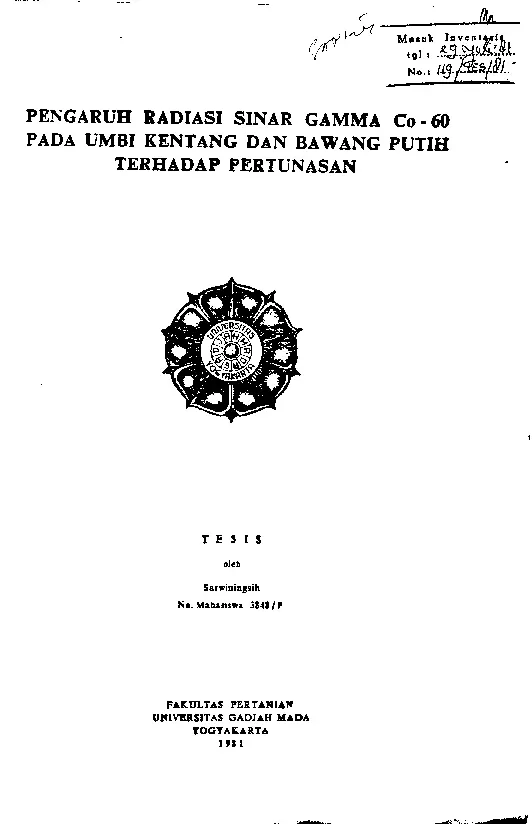 Pengaruh Radiasi Sinar Gamma Co -60 Pada Umbi Kentang Dan Bawang Putih Terhadap Pertunasan Sarwiningsih Fakultas Pertanian UGM Konten Lokal Konten Lokal 31388