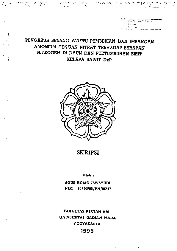 PENGARUH SELANG WAKTU PEMBERIAN DAN IMBANGAN AMONIUM DENGAN NITRAT TERHADAP SERAPAN NITROGEN DI DAUN DAN PERTUMBUHAN BIBIT KELAPA SAWIT DxP Agus Romo Iswayudi Fakultas Pertanian UGM Konten Lokal Konten Lokal 49203