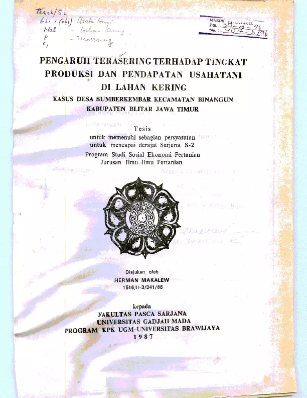 Pengaruh Terasering Terhadap Tingkat Produksi Dan Pendapatan Usahatani Di Lahan Kering Kasus Desa Sumberkembar Kecamatan Binangun Kabupaten Blitar Jawa Timur Herman Makalew Fakultas Pertanian UGM Konten Lokal Konten Lokal 31082
