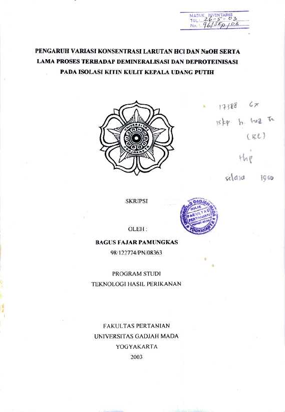 Pengaruh Variasi Konsentrasi Larutan HCl Dan NaOH Serta Lama Proses Terhadap Demineralisasi Dan Deproteinisasi Pada Isolasi Kitin Kulit Kepala Udang Putih Bagus Fajar Pamungkas Fakultas Pertanian UGM Konten Lokal Konten Lokal 48314