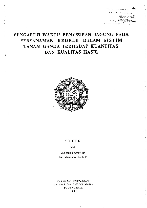 Pengaruh Waktu Penyisipan Jagung Pada Pertanaman Kedele Dalam Sistem Tanam Ganda Terhadap Kuantitas Dan Kualitas Hasil Bambang Soermarhadi Fakultas Pertanian UGM Konten Lokal Konten Lokal 31050