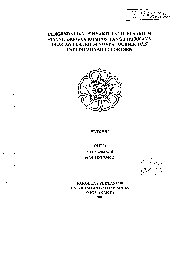 IV HASIL DAN PEMBAHASAN A Intensitas Penyakit Layu Fusarium di Lapangan Gejala penyakit layu fusarium yang disebabkan oleh Fusarium oxysporum f sp cubense di lapangan berupa menguningnya daun Dimulai dari tepi pelepah daun dan makin lama makin meluas Gejala dimulai dari daun yang tua terlebih dahulu dan selanjutnya gejala timbul pada daun yang lebih muda Gambar 1 Gambar 1 Gejala penyakit layu pada pisang yang disebabkan oleh Fusarium oxysporum f sp cubense Tabel 1 menunjukkan bahwa intensitas penyakit layu fusarium pada tanaman pisang yang diperlakukan dengan agens hayati tidak berbeda nyata dengan kontrol bahkan pada perlakuan kompos yang diperkaya dengan 15