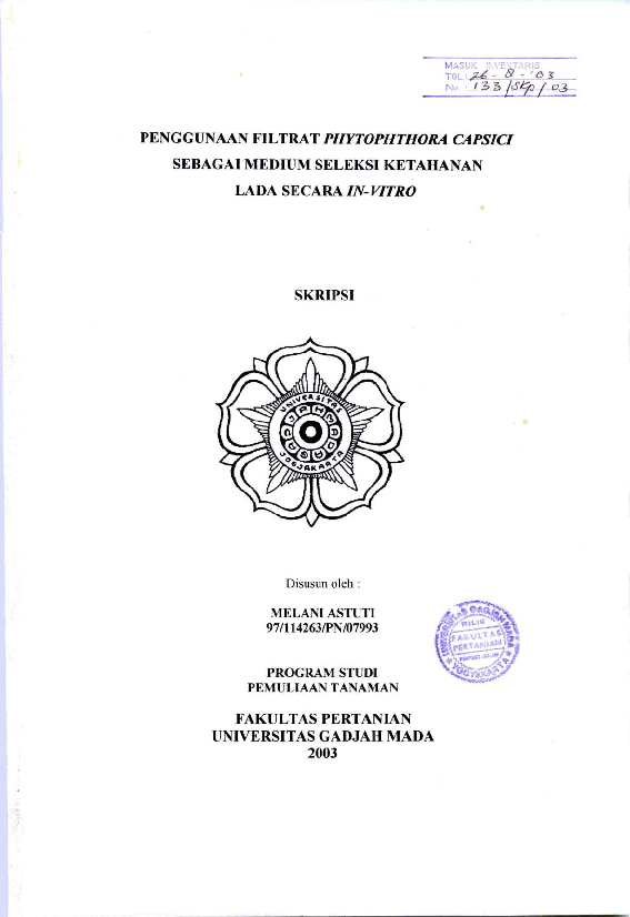 Penggunaan Filtrat Phytophthora CapsiciSebagai Medium Seleksi KetahananLada Secarain-Vitro Melani Astuti Fakultas Pertanian UGM Konten Lokal Konten Lokal 48439