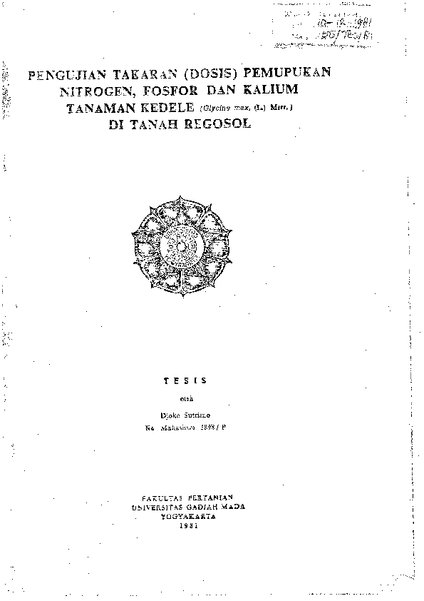Pengujian Takaran (Dosis) Pemupukan Notrogen, Fosfor Dan Kalium Tanaman Kedele (Glycine Max, (L) Merr) Di Tanah Regosol Djoko Sutrisno Fakultas Pertanian UGM Konten Lokal Konten Lokal 48280