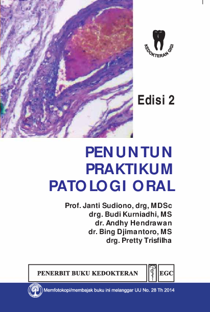 Patologi adalah ilmu dasar yang harus dikuasai oleh mahasiswa sebelum masuk ke Kedokteran Gigi Terapan atau Klinik Patologi mempelajari berbagai kelainan yang nantinya akan ditemukan pada keadaan klinis Edisi revisi dari Penuntun Praktikum Patologi Anatomi yang populer dan telah digunakan selama bertahun tahun sebagai acuan wajib mahasiswa kedokteran gigi ini telah direvisi secara menyeluruh dan berisikan gambar sediaan patologi yang membantu dalam penentuan diagnosis kelainan atau penyakit dalam rongga mulut Sebagai upaya memenuhi kebutuhan mahasiswa yang semakin meningkat di bidang patologi anatomi sebagian gambar yang ada dalam edisi kedua ini adalah gambar baru pengganti gambar sediaan pada edisi sebelumnya