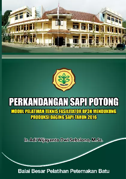 Sinopsis Singkat Buku: Perkandangan Sapi Potong Buku ini merupakan modul pelatihan teknis yang disusun untuk mendukung produksi daging sapi tahun 2016, khususnya bagi fasilitator BP3K (Badan Pelatihan dan Pengembangan Sumber Daya Manusia Pertanian). Buku ini membahas secara mendalam tentang tata cara pengelolaan kandang, termasuk kandang penggemukan dan kandang pembibitan. Dalam buku ini dijelaskan secara sistematis tentang konsep kandang, fungsi kandang, serta hal-hal yang perlu diperhatikan dalam pengelolaan kandang. Selain itu, juga diuraikan berbagai jenis kandang seperti kandang individu dan kandang sistem lepas berkelompok, serta ketersediaan bahan bangunan yang mendukung pembangunan kandang yang efektif dan efisien. Buku ini dilengkapi dengan rangkuman, tes formatif, tindak lanjut, serta kunci jawaban untuk memudahkan pembelajaran dan pemahaman pembaca. Buku ini sangat relevan bagi para pelaku peternakan, pelatih, dan pengambil kebijakan dalam meningkatkan kualitas pengelolaan kandang dan produktivitas ternak sapi potong.