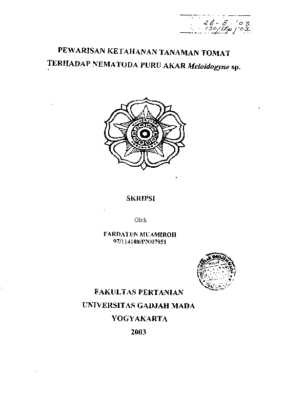 Pewarisan Ketahanan Tanaman Tomat Terhadap Nematoda Paru Akar Meloidogyne sp. Fardatun Muamiroh Fakultas Pertanian UGM Konten Lokal Konten Lokal 48491
