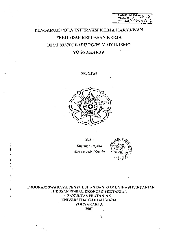 PIJJNGARUH POLA INTERAKSI KERJA KARYAWAN TERHADAP KEPUASAN KERJA DI PT.MADU BARU PG/PS MADUKISMO YOGYAKARTA Sugeng Sumjaka Fakultas Pertanian UGM Konten Lokal Konten Lokal 48884