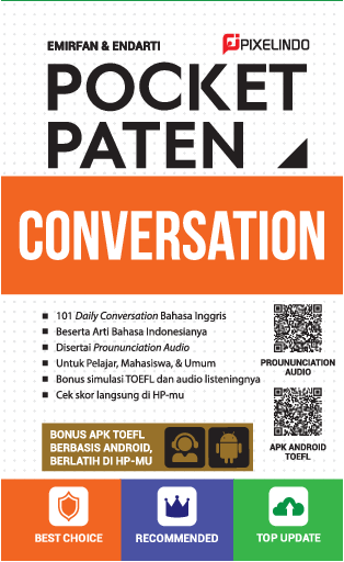 Dalam belajar bahasa Inggris terdapat beberapa subjek atau unsur yang harus dipahami oleh para pembelajar Salah satunya adalah conversation Sebagaimana subjek pelajaran bahasa Inggris lainnya subjek ini sangat perlu dipelajari dengan saksama Hal ini penting untuk menemukan kunci kunci utama agar dapat mengerti dan bahkan menguasai percapakan bahasa Inggris Dengan demikian nantinya akan mudah dalam berkomunikasi dengan dunia internasional Buku POCKET PATEN Conversation ini hadir untuk menjawab kebutuhan tidak hanya bagi para pelajar dan mahasiswa tetapi juga bagi masyarakat umum yang hendak mengasah kemampuan conversation Buku ini berisi 101 daily conversation disertai artinya Selain itu pembaca sekalian akan mendapatkan bonus simulasi TOEFL yang dapat menjadi media latihan Selamat membaca