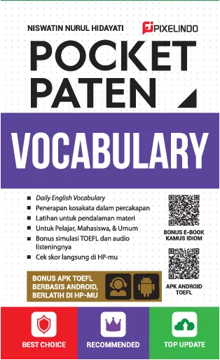 Bahasa Inggris saat ini tidak hanya diguna kan untuk suatu lini bidang kehidupan saja Akan tetapi hampir setiap lini kehidupan memerlukan kemampuan berbahasa Inggris yang memadai Hal ini tak lepas dari adanya globalisasi yang menuntut kita bergaul ber teman dan bahkan bersaing dengan warga dunia lainnya Bahasa Inggris penting dikua sai karena bahasa inilah yang diakui sebagai bahasa internasional Dalam belajar bahasa Inggris terdapat bebe rapa subjek atau unsur yang harus dipahami oleh para pembelajar Salah satunya adalah vocabulary Sebagaimana subjek pelajaran bahasa Inggris lainnya subjek ini sangat per lu dipelajari dengan saksama Hal ini penting untuk menguasai berbagai kata istilah isti lah bahkan mungkin ungkapan yang sering muncul dalam teks dan percakapan bahasa Inggris Dengan demikian nantinya akan mudah mengerti makna dan maksud dari kata kata yang muncul saat berkomunikasi dengan dunia internasional vi Buku POCKET PATEN Vocabulary ini hadir un tuk menjawab kebutuhan tidak hanya bagi para pelajar dan mahasiswa tetapi juga bagi masyarakat umum yang hendak mengasah kemampuan vocabulary Buku ini berisi ma teri materi tentang vocabulary yang diikuti dengan berbagai paket soal latihan lengkap dengan kunci dan pembahasan Selain itu pembaca sekalian akan mendapatkan simu lasi TOEFL TOEIC dan audio listening yang dapat menjadi media latihan Selamat mem baca