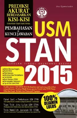 Sinopsis Buku: Buku ini merupakan prediksi akurat untuk ujian masuk Sekolah Tinggi Akuntansi Negara (STAN) tahun 2015. Buku ini dibuat dengan tujuan untuk membantu calon mahasiswa dan mahasiswi yang ingin mengikuti ujian saringan masuk STAN. Buku ini merangkum secara lengkap soal-soal yang paling tersulit dan dilengkapi dengan pembahasan yang jelas dan terstruktur. Dengan adanya buku ini, para pembaca dapat mempelajari dan menjawab semua soal-soal yang terdapat di dalam buku ini, sehingga memastikan mereka akan aman dan siap menghadapi ujian. Buku ini juga dilengkapi dengan kunci jawaban dan pembahasan untuk setiap bagian ujian, yaitu Tes Kemampuan Umum, Bahasa Indonesia, dan Bahasa Inggris. Buku ini dilengkapi dengan informasi terkait STAN, seperti profil singkat STAN, masa studi, tempat pendidikan, dan ketentuan kelulusan. Buku ini sangat bermanfaat bagi para calon mahasiswa STAN yang ingin mempersiapkan diri secara optimal sebelum menghadapi ujian.